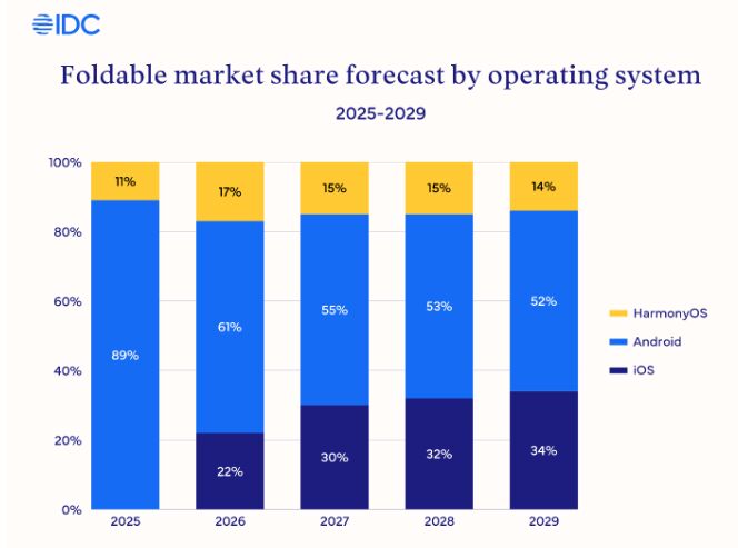 IDC預測2025年全球折疊屏智能手機出貨量達到2060萬臺,同比增長10%,并認為得益于硬件創新與巨頭入局,2026年會成為市場真正的轉折點,同比增幅將躍升至30%。展望長期趨勢,折疊屏手機的復合年均增長率(CAGR)在2029年前將保持在17%,遠超傳統智能手機不足1%的增速,屆時折疊屏產品將占據智能手機市場總產值的10%以上。