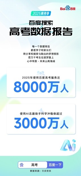 百度搜索聯(lián)合中國(guó)教育在線(xiàn)發(fā)布《2025高考數(shù)據(jù)報(bào)告》,結(jié)合百億搜索大數(shù)據(jù),傳遞高考分?jǐn)?shù)之外的數(shù)據(jù)洞察。2025年百度高考服務(wù)近8000萬(wàn)人,百度搜索依然是萬(wàn)千學(xué)子了解報(bào)