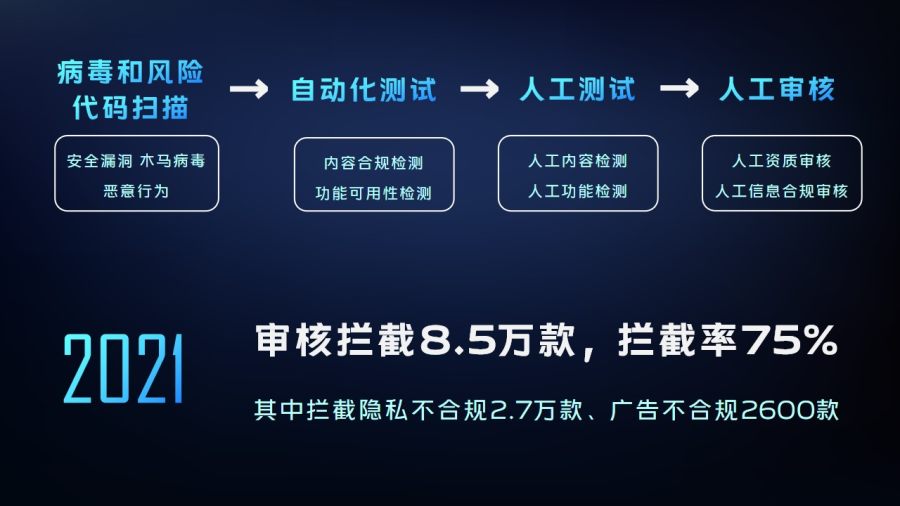 vivo應用商店擁有一套完善和嚴格的入庫審測流程,每個APP需經過病毒和風險代碼掃描、自動化測試、人工深度測試、人工資質和信息審核共四道審測程序,方能上架。數據顯示,今年以來,vivo應用商店已審核攔截8.5萬款不合規APP,攔截率超75%。