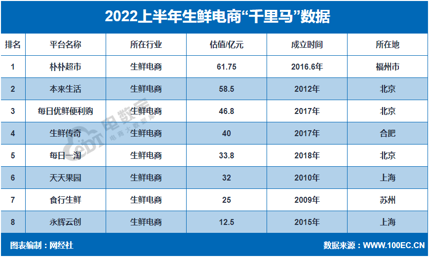 2022上半年生鮮電商千里馬8家,分別是樸樸超市、本來生活、每日優鮮便利購、生鮮傳奇、每日一淘、天天果園、食行生鮮、永輝云創,估值分別為61.75億元、58.5億元、46.8億元、40億元、33.8億元、32億元、25億元、12.5億元,總估值達310.35億元。