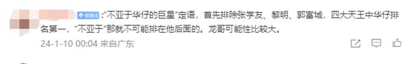 有網(wǎng)友分析:" 不亞于華仔的巨星 " 定語(yǔ),首先排除張學(xué)友、黎明、郭富城,四大天王中華仔排名第一," 不亞于 " 那就不可能排在他后面的。龍哥可能性比較大。