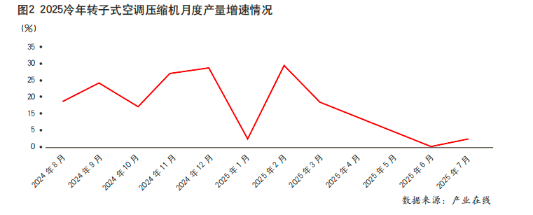 外銷市場的不確定性也在增加。連續3年的高增長后,海外市場逐步進入 “去庫存” 階段。同時,中美關稅戰并未結束,全球關稅壁壘逐步提高,中國空調出口的成本優勢被削弱。2025 年 4 月后,空調外銷訂單增速在連續3年高增后首次出現放緩跡象,對壓縮機需求的拉動作用隨之減弱(見圖5)。